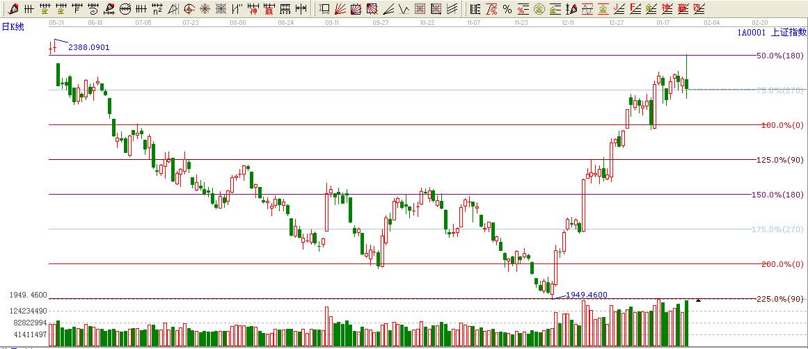 ☆依據(jù)贏家波段百分比伸線提示:大盤180度位置2360壓力遇阻回落,下方支撐270度位置2302點(diǎn)。