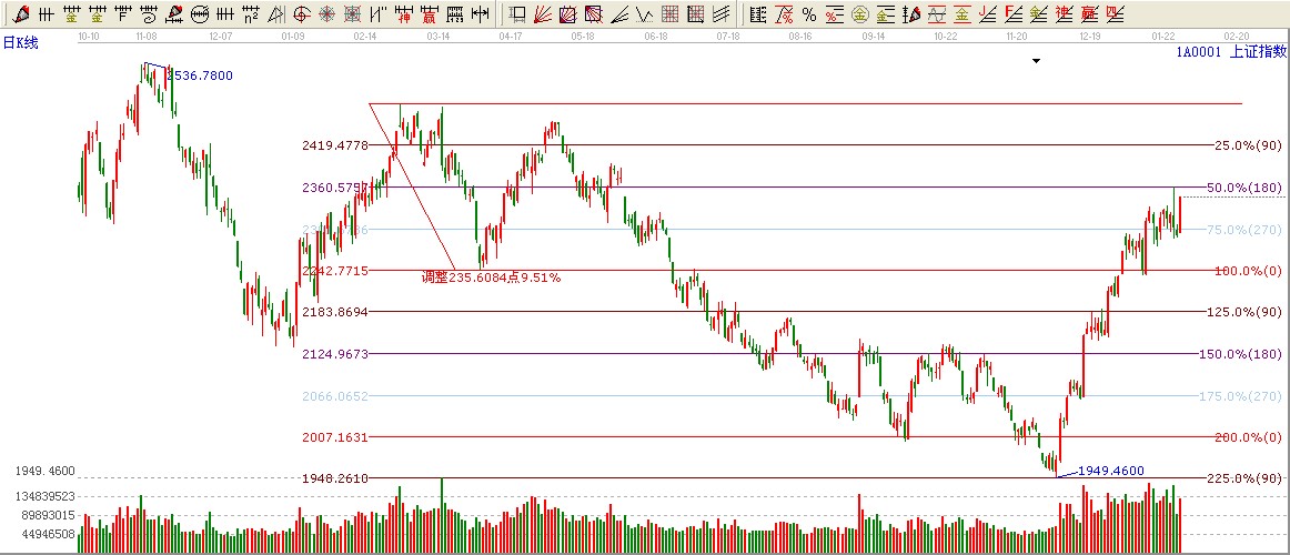 ★依據(jù)贏家波段百分比伸線提示:大盤270度位置長陽拉起,目標(biāo)壓力依然是180度位置2362附近,只有突破180度位置才會看高一線至90度位置。
