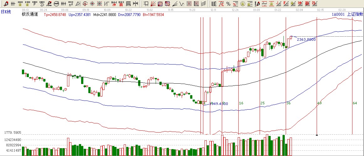 綜上所述:極反通道藍色上軌位置不破,按照極反通道應用法則看高一線至2420附近。這里跟波段延伸線90度位置形成共振壓力。短期2330成為短期強支撐。