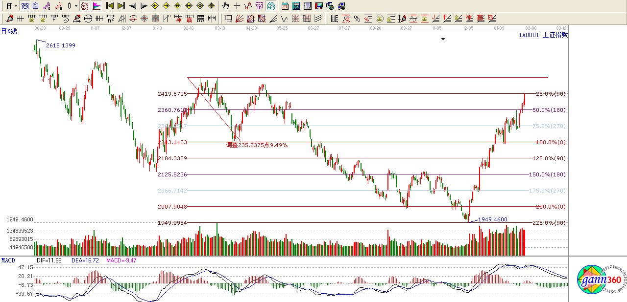 ★依據(jù)贏家波段百分比伸線提示:大盤處于90度位置附近沖高震蕩難免,0度位置是2478點。