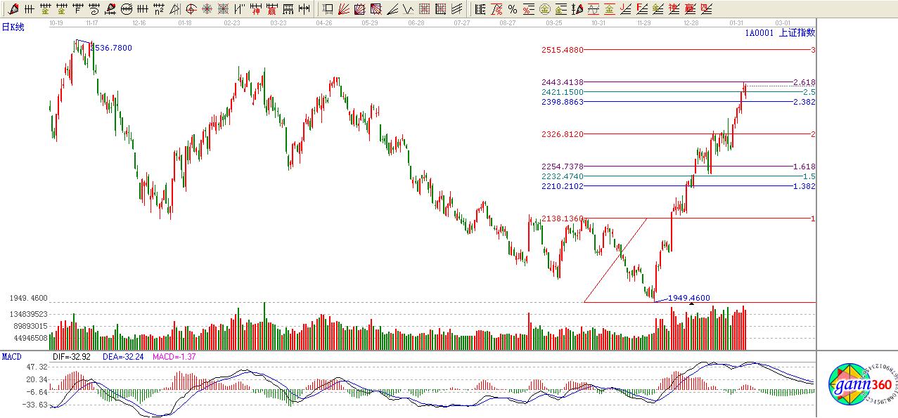綜上所述:大盤極反通道藍(lán)色上軌位置不破,按照極反通道應(yīng)用法則看高一線至2457點,短期黃金分割2.382/2.618位置震蕩難免。