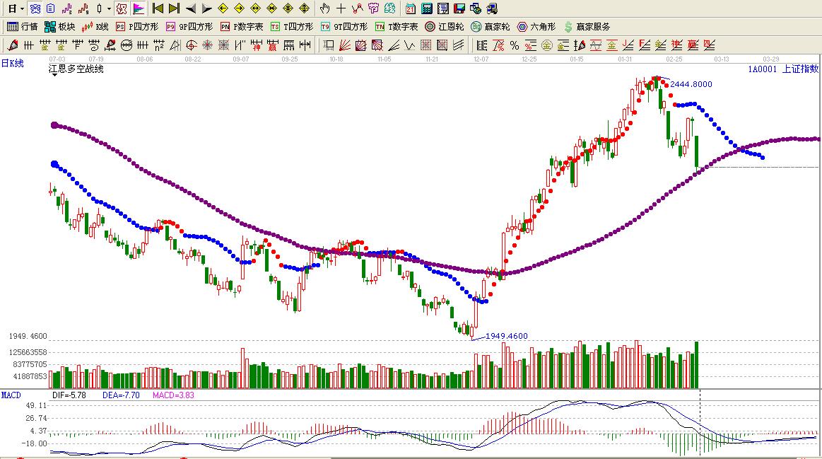 ★依據(jù)贏家江恩多空戰(zhàn)線提示:目前大盤運(yùn)行在長(zhǎng)期紫色多空線附近,短期藍(lán)色線上方,謹(jǐn)慎做多。