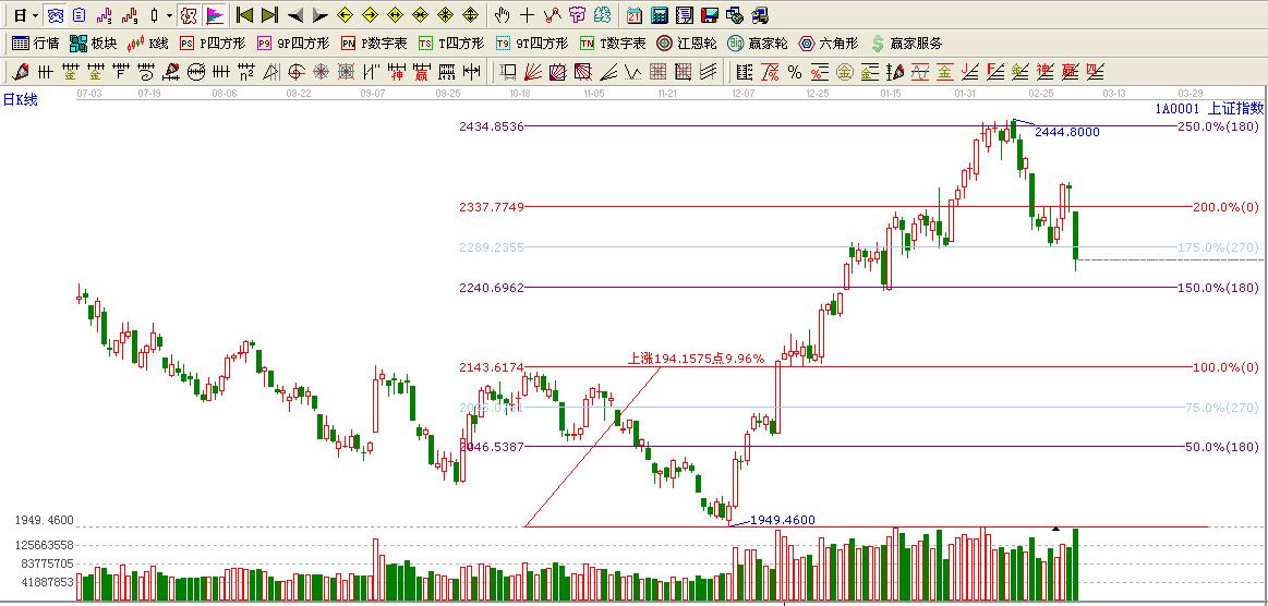 ☆依據(jù)贏家波段百分比延伸線提示:大盤消息影響低開(kāi)破位0度位置,按照百分比延伸線用法,跌破一線看低一線,短期270度位置2290附近壓力,下方支撐180度位置2240附近。