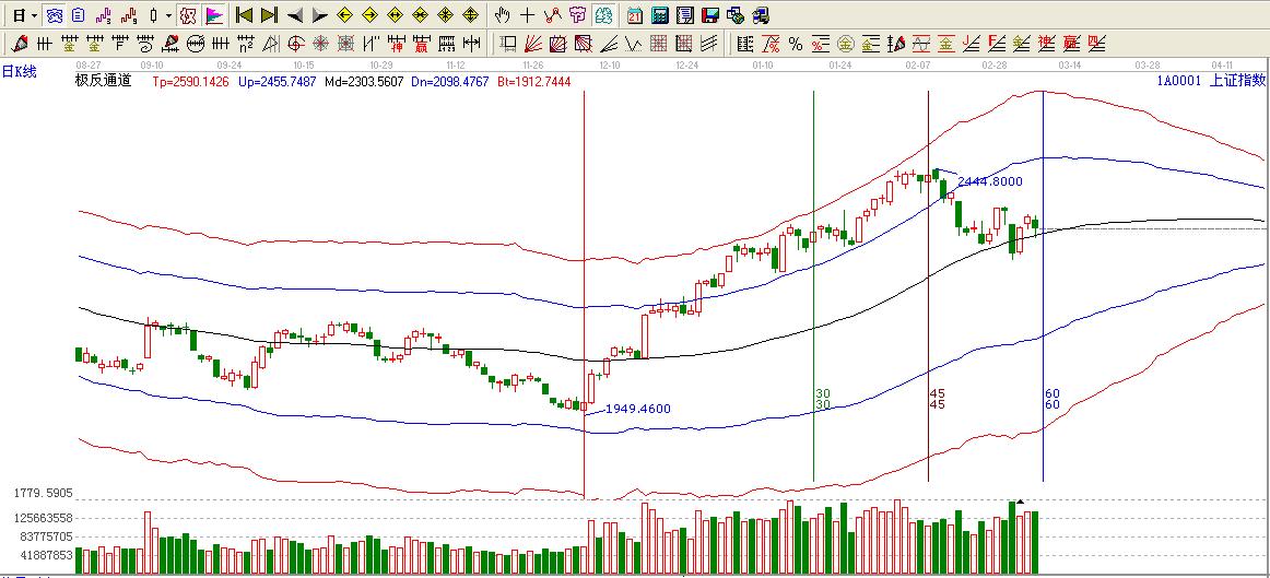 綜上所述:大盤處于極反通道生命線上方,按照極反通道法則:極反通道生命線不破看高至極反通道藍色上軌2457。