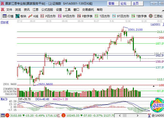 周二大盤低開一路下探至江恩百分比180度及半年線位置,尾盤權重股拉抬跌幅收窄,創(chuàng)業(yè)板勉強收紅。板塊方面,券商微漲,石油、銀行、保險調整拖累指數(shù),二線藍籌表現(xiàn)不佳;熱點題材混亂,小部分次新、科技股超跌反彈,短股橫行,上海國改、油改、農業(yè)零跌,個股漲跌互現(xiàn)成交量同前日持平。技術方面,今日是大盤日線時間窗,江恩百分比180度3084點止跌回升,短周期底背離明確,此處預計展開反抽,力度能回補缺口就相當不錯了,反彈結束預計市場還延續(xù)下探,因此操作上反彈中結合所持個股情況,決定是否加的1成波段倉出掉,等待二次加倉信號,3090、3080為日內支撐,3121、3135為日內阻力,僅供參考,不構成任何投資建議。