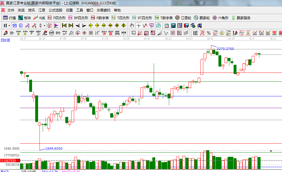 今天是日線的時間窗口,兩市圍繞日線外軌線展開震蕩整理,收陰十字星,盤面上,醫(yī)療保健,物流、電力領漲大盤,創(chuàng)業(yè)板個股繼續(xù)回調,權重股持續(xù)低迷,今天成交量比昨日有所減少,依據(jù)贏家江恩工具分析,短期阻力位極反通道藍色外軌線2257點,此區(qū)間市場資金表現(xiàn)謹慎,操作方面穩(wěn)健者適當回避風險,明天延續(xù)弱勢震蕩概率偏大。