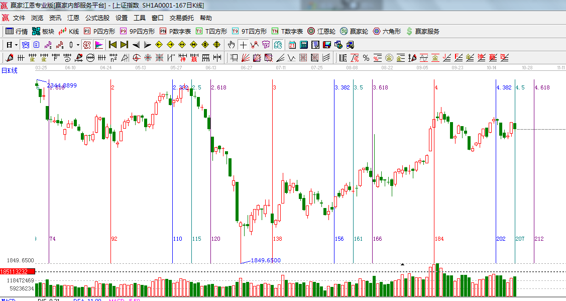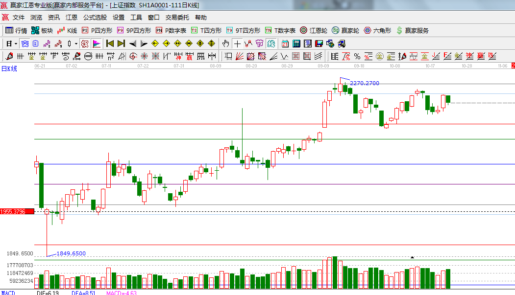 ☆依據(jù)贏家江恩系統(tǒng)波段百分比延伸提示:江恩百分比315度是2196,270度位置是2232;