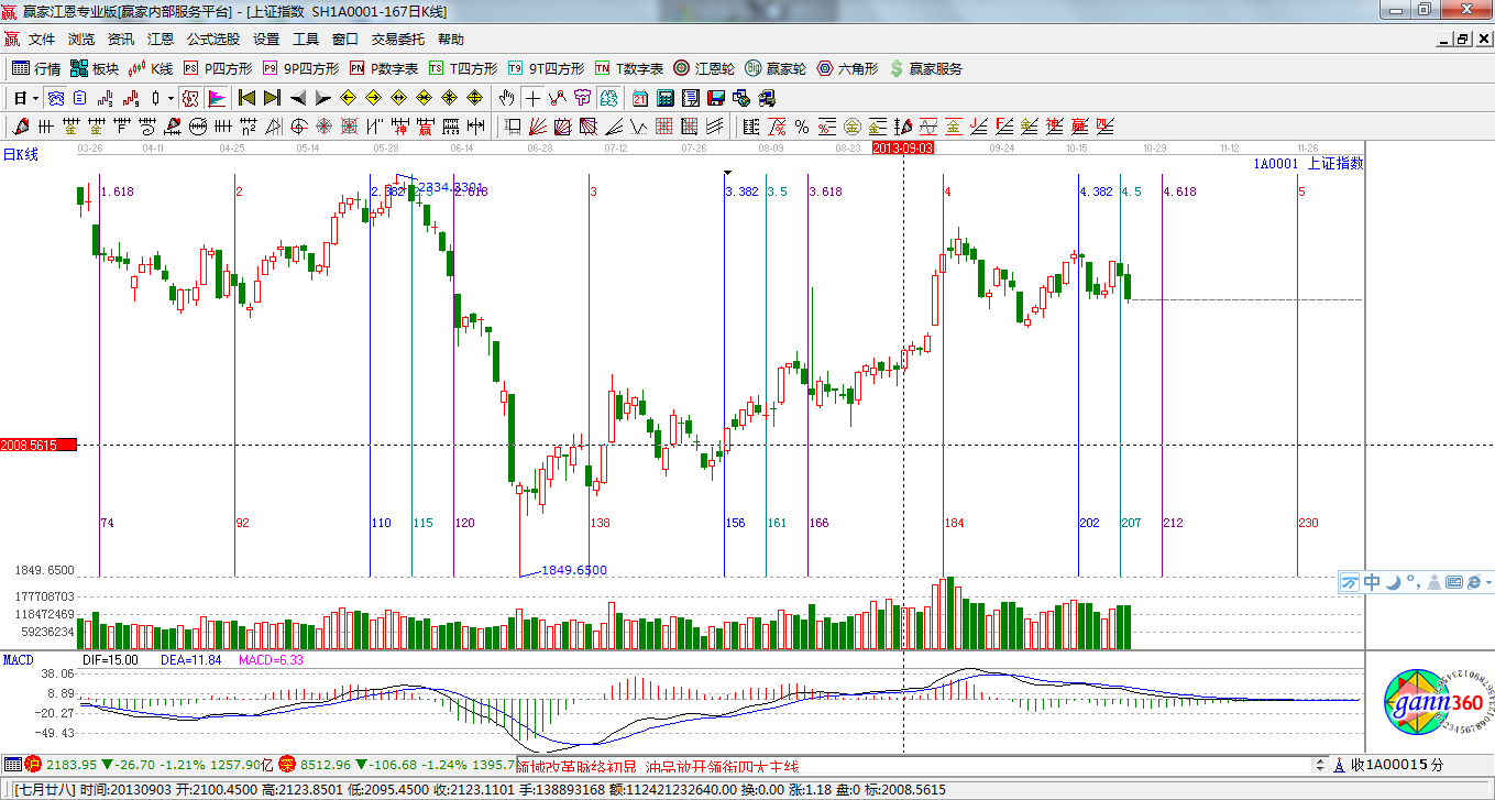 ☆依據(jù)贏家江恩系統(tǒng)波段百分比延伸提示:江恩百分比0度是2160;