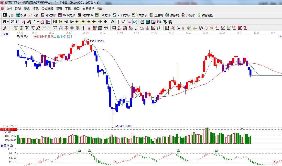 ☆依據(jù)贏家江恩系統(tǒng)乾坤K線提示: 紫色多空轉(zhuǎn)換位置轉(zhuǎn)為藍(lán)色做空休息區(qū);