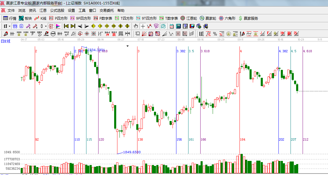 ★依據(jù)贏家江恩系統(tǒng)波段百分比延伸提示:江恩百分比45度是2125;