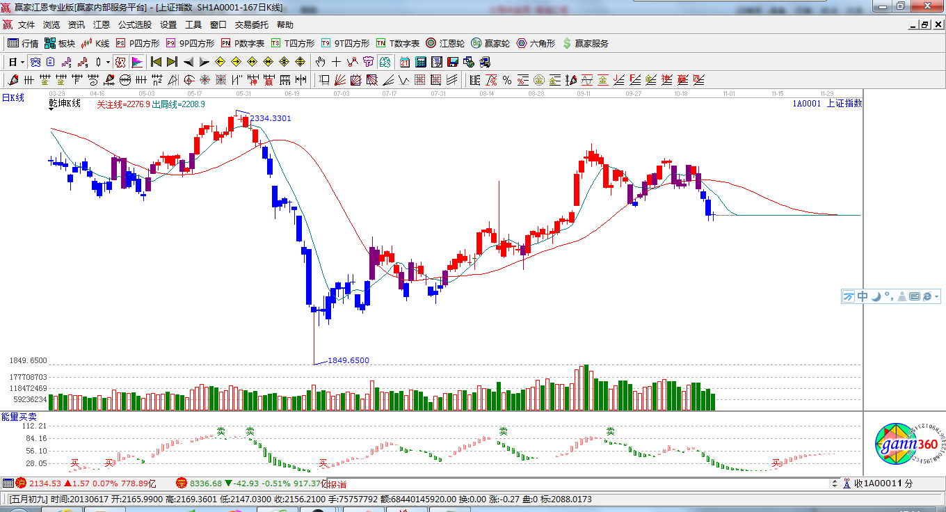 ☆依據(jù)贏家江恩系統(tǒng)乾坤K線提示: 藍(lán)色休息區(qū)以保守或空倉為主;