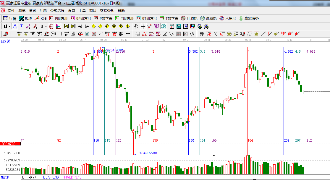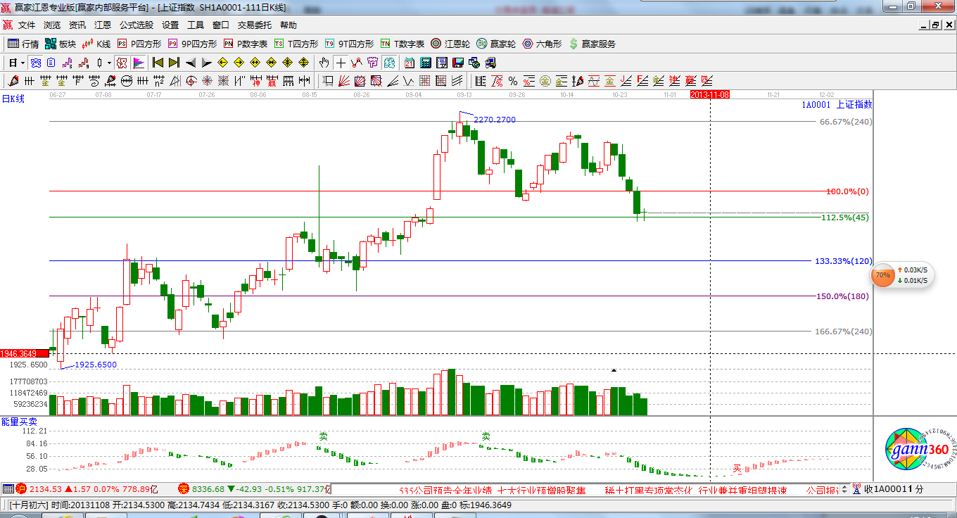 ★依據(jù)贏家江恩系統(tǒng)波段百分比延伸提示:江恩百分比45度是2125;