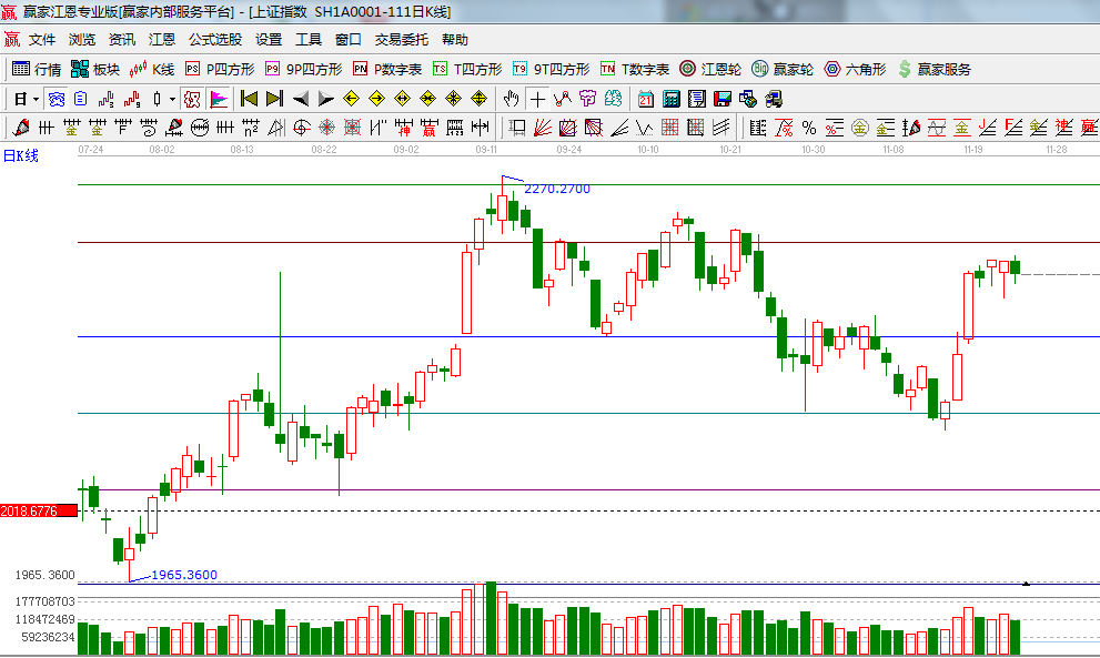 ☆依據(jù)贏家江恩系統(tǒng)波段百分比延伸提示:黃金分割價格圖0.236位置是2219點,0.382位置是2050點;