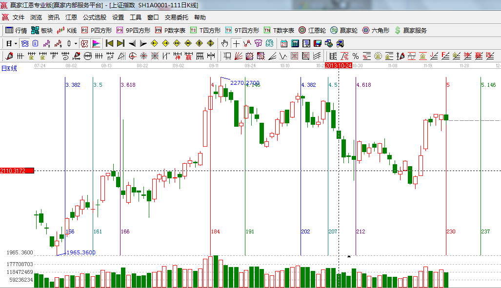 咨詢:13333833889本周初18號滬指放量中陽突破江恩軟件極反通道生命線2170位置,隨后轉(zhuǎn)入橫盤震蕩格局,市場賺錢效應(yīng)與活躍度增加成交量顯著放大,市場熱點圍繞改革題材炒作,如二胎開放、軍工、天津自貿(mào)區(qū),特別是進入年底行情高送轉(zhuǎn)概念股也將成為持續(xù)的熱點,滬指趨勢不破極反通道生命線處于安全操作區(qū)投資者可繼續(xù)這類短期調(diào)整后的機會;技術(shù)方面從K線組合判斷中陽橫盤后遇到費氏時間將出現(xiàn)方向選擇,通常時間窗為陽線后的第3天、5天、8天,重點觀察市場下周初變化,波段思路看好未來行情,倉位上可保持在5成或5成以上,短線、波段結(jié)合操作;