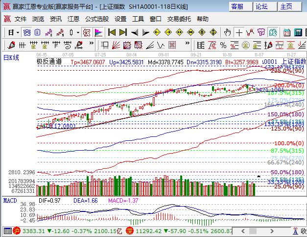 周四幾大指數低開低走再度調整,滬指等待考驗日線生命線,深成指走在邁向生命線的路上,創(chuàng)業(yè)板指則大跌1%跌破生命線。板塊方面,釀酒、券商、家電、煤炭、保險和醫(yī)藥等成為幾個為數不多的紅盤板塊;題材方面,僅次新、填權、人工智能和基因等局部表現(xiàn),特斯拉、OLED、石墨烯、環(huán)保和蘋果概念領跌,個股下跌居多,跌幅4%以上的個股150家,成交量較前日萎縮。技術方面,受尾盤權重銀行、石油、保險回抽,日線試踩江恩百分比315度3370點后拉回,對應的短周期15、30、60分鐘均在極反通道生命線下弱勢區(qū)域,昨日早盤開盤群中分析,滬指破60分鐘生命線則盤面有強勢震蕩轉變成弱勢震蕩,日線極反通道生命線的考驗更加嚴峻,同時已提出轉為防守策略,波段倉位4成,短線降低1成至2成,3370、3360為日內支撐,3394、3400為日內壓力。僅供參考,不構成任何投資建議。
