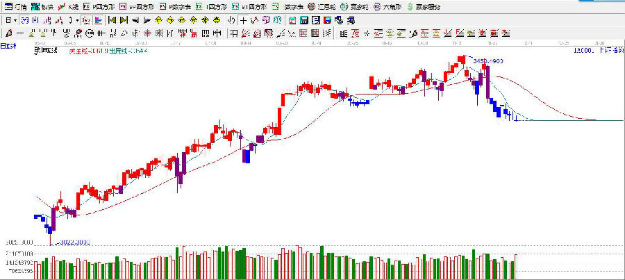 ★依據(jù)贏家江恩理論系統(tǒng)乾坤K線提示:紅色關注線之下,k線由紫色轉變?yōu)樗{色線,依據(jù)規(guī)則,趨勢空頭。