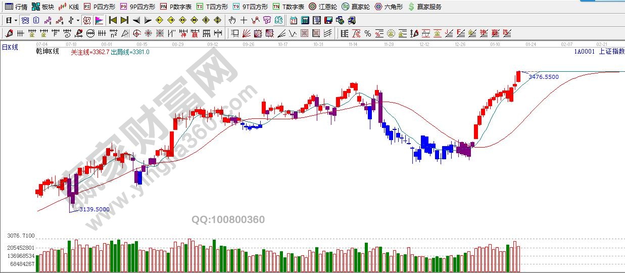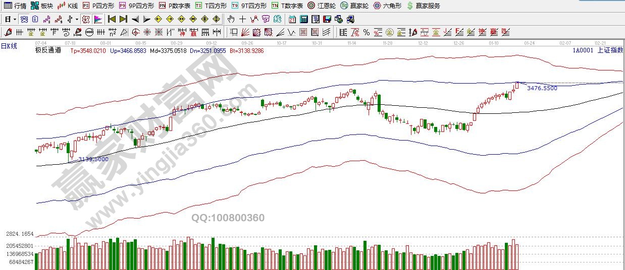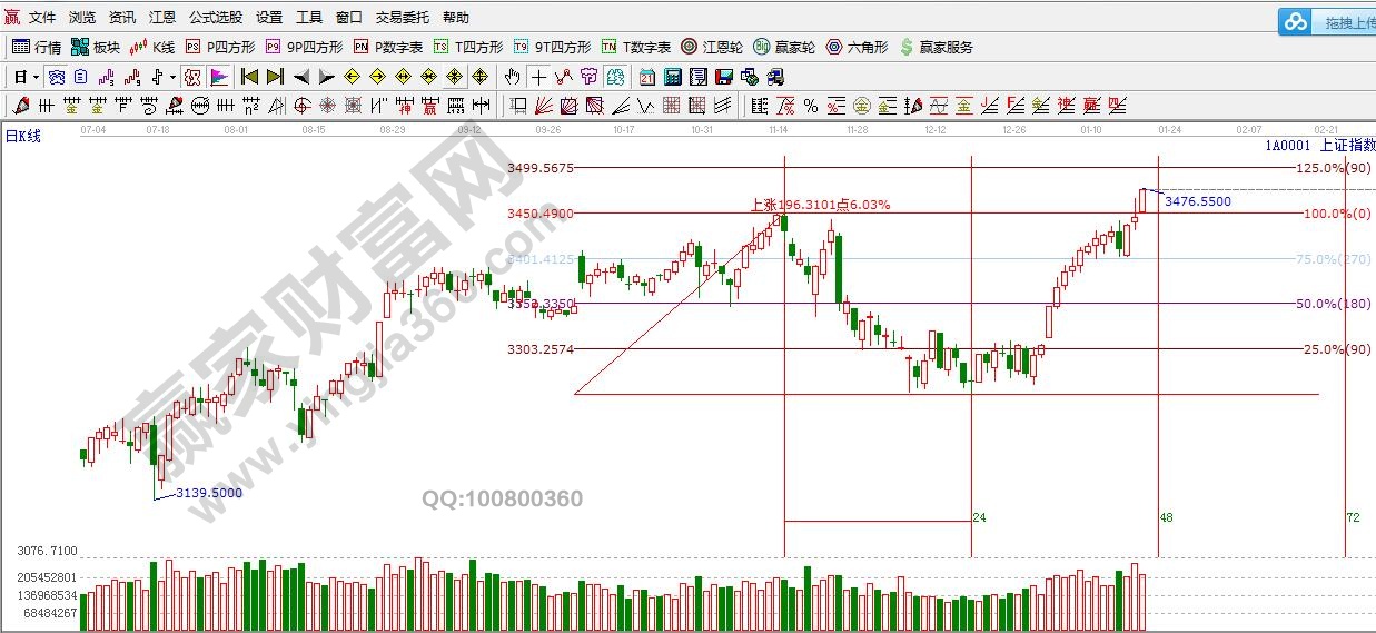 江恩看盤綜述:依據(jù)贏家江恩技術(shù)工具分析得出:周四,滬指繼續(xù)強(qiáng)勢上攻再創(chuàng)新高,個股出現(xiàn)連續(xù)的分化,在權(quán)重瘋狂的拉升下要謹(jǐn)防指數(shù)的誘多嫌疑,繼續(xù)關(guān)注極反通道藍(lán)色外軌線3478點(diǎn)的爭奪,依據(jù)規(guī)則,藍(lán)色外軌線會有震蕩情況出現(xiàn)。從中期角度看,繼續(xù)看好指數(shù)向上趨勢,但短期需要謹(jǐn)防隨時出現(xiàn)的技術(shù)性調(diào)整,尤其是金融、地產(chǎn)等標(biāo)的的回落可能。操作上,建議戰(zhàn)略性適當(dāng)減倉,關(guān)注超跌年報預(yù)增的標(biāo)的。