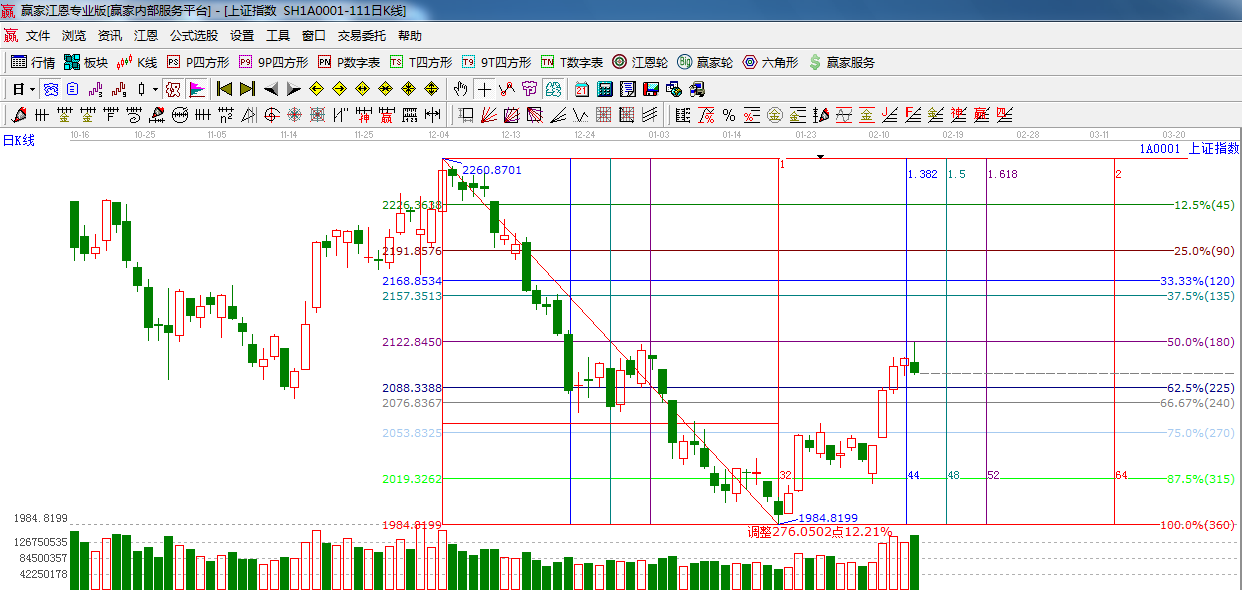☆ 依據(jù)贏家江恩系統(tǒng)黃金時間周期線提示:今日是前幾天提到的時間窗口,指數(shù)沖高回落,收倒垂頭線,短期注意風(fēng)險,下一個江恩時間窗口是2月18日(黃金時間1.5的時間窗口)。