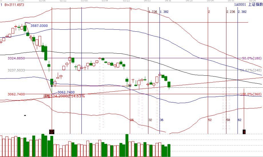 ?、贉付讨芷跍?5分鐘觸及紅色極弱通道線,30分鐘觸及弱勢外軌線,市場如橫盤則會鈍化極反通道幾條線;日線破90度3126點,45度是3077點,這條線破位則大盤將回到另外一個循環(huán)中。