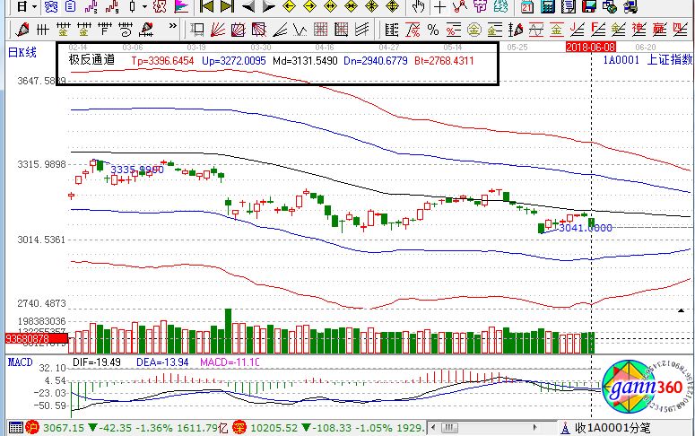 滬指跌1.36%,報(bào)收3067點(diǎn);深成指跌1.05%,報(bào)收10205點(diǎn);創(chuàng)業(yè)板跌1.09%,報(bào)收1711點(diǎn)。從盤面上看,小米概念、富士康概念、無人零售、5G、細(xì)胞免疫治療、半導(dǎo)體等少數(shù)板塊上漲,分散染料、證券、煤炭、有色、草甘膦、自由貿(mào)易港等板塊下跌。全天,滬股通凈流出6.8億元,深股通凈流入16億元。相應(yīng)的極反通道指標(biāo)的支撐壓力提示,如下圖所示: