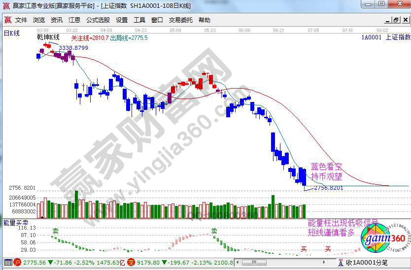 咨詢:13333833889周五一根大陽反抽,今日一根大陰吞噬,滬指反抽受極反通道藍線壓制,再度弱勢下行。盤中創(chuàng)兩年新低,保險、地產(chǎn)、家電、銀行等權(quán)重股集體殺跌,上漲50指數(shù)大跌近4%。板塊方面,兩市僅海南、啤酒、賽馬等幾個板塊上漲;鋼鐵、粵港澳、煤炭、銀行等板塊跌幅居前。個股方面,欣銳科技打敗曉程科技正式成為市場總龍頭,華紡股份、麗鵬股份、宏達新材等依然走出強勢連板行情。截止收盤,滬指下跌2.52%,報收2775點;深成指下跌2.13%,報收9179點;創(chuàng)業(yè)板下跌1.14%,報收1588點。