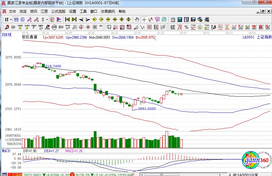 滬指漲0.26%,報2876點;深成指跌0.03%,報9178點;創(chuàng)業(yè)板指漲0.10%,報1561點。盤面上看,國企改革、石油采掘、二胎概念、租售同權(quán)等板塊漲幅居前;深圳國資改革、鋼鐵、軍工、水泥、化工新材料、煤炭等板塊跌幅居前。滬股通凈流入19億,深股通凈流入13億。相應(yīng)的極反通道指標的支撐壓力提示,如下圖所示: