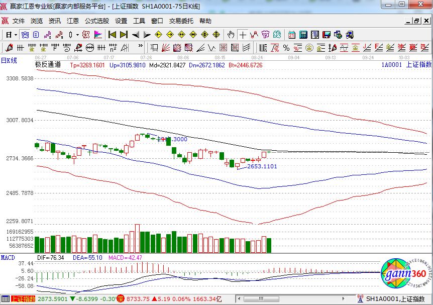 滬指下跌0.11%,報收2777點;深成指上漲0.06%,報收8733點;創(chuàng)業(yè)板下跌0.02%,報收1493點。從盤面上看,分散染料、在線旅游、量子通信等板塊漲幅居前;杭州亞運會、公交、可燃冰等板塊跌幅居前。滬股通凈流入6.34億,深股通凈流入9.84億。相應(yīng)的極反通道指標的支撐壓力提示,如下圖所示: