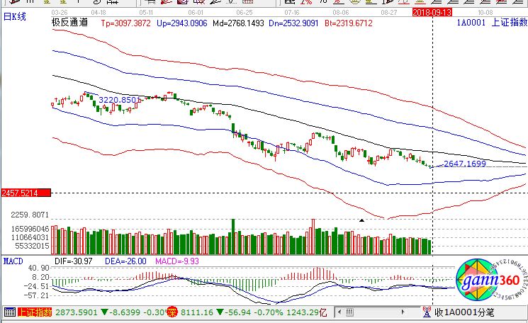 滬指跌0.33%,報收2656點;深成指跌0.70%,報收8111點;創(chuàng)業(yè)板跌0.67%,報收1385點。從盤面上看,軍工、大飛機、造紙、鋰電池、海工裝備、無人機等板塊上漲;白酒、醫(yī)藥、分散染料、人臉識別、細胞免疫治療、豬肉等板塊跌幅居前。滬股通凈流出7.5億,深股通凈流出1.8億。相應(yīng)的極反通道指標的支撐壓力提示,如下圖所示: