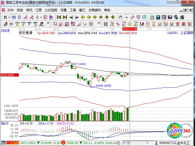 滬指跌0.85%,報(bào)收2632點(diǎn);深成指跌0.69%,報(bào)收7908點(diǎn);創(chuàng)業(yè)板跌0.45%,報(bào)收1385點(diǎn)。從盤面上看,電子發(fā)票、創(chuàng)投、自由貿(mào)易港、互聯(lián)網(wǎng)彩票、集成電路、芯片等板塊漲幅居前;可燃冰、石油、白酒、海工裝備、證券、ST板塊等板塊跌幅居前。滬股通凈流出4.5億,深股通凈流出1.9億。相應(yīng)的極反通道指標(biāo)的支撐壓力提示,如下圖所示: