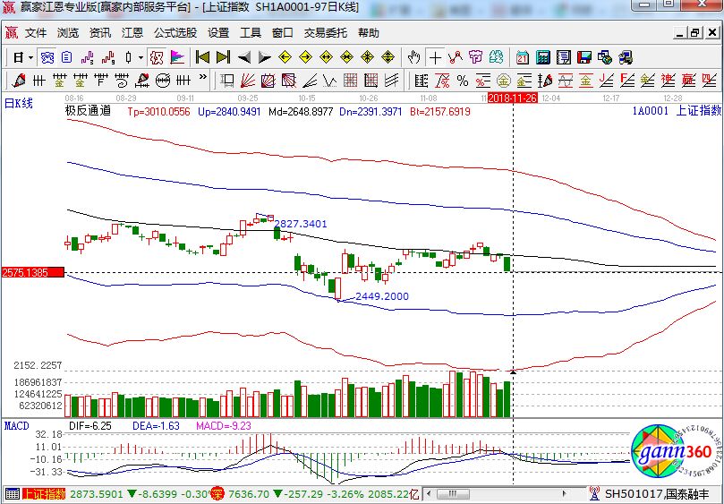滬深兩市全天一路單邊殺跌,創(chuàng)業(yè)板綜指大跌超4%,個(gè)股一片慘綠,創(chuàng)投龍頭光洋股份和市北高新開盤一字封跌停,嚴(yán)重打擊市場人氣,創(chuàng)投強(qiáng)勢股集體大跌,民豐特紙、九鼎投資、魯信創(chuàng)投等超30只個(gè)股跌停,券商股也表現(xiàn)較弱,長城證券、天風(fēng)證券均跌超7%,高位市場主線熱點(diǎn)開啟殺跌模式,市場賺錢效應(yīng)降溫。滬指跌2.49%,報(bào)收2579點(diǎn);深成指跌3.26%,報(bào)收7636點(diǎn);創(chuàng)業(yè)板跌3.34%,報(bào)收1308點(diǎn)。滬股通凈流出8000萬,深股通凈流出6.7億。相應(yīng)的極反通道指標(biāo)的支撐壓力提示,如下圖所示: