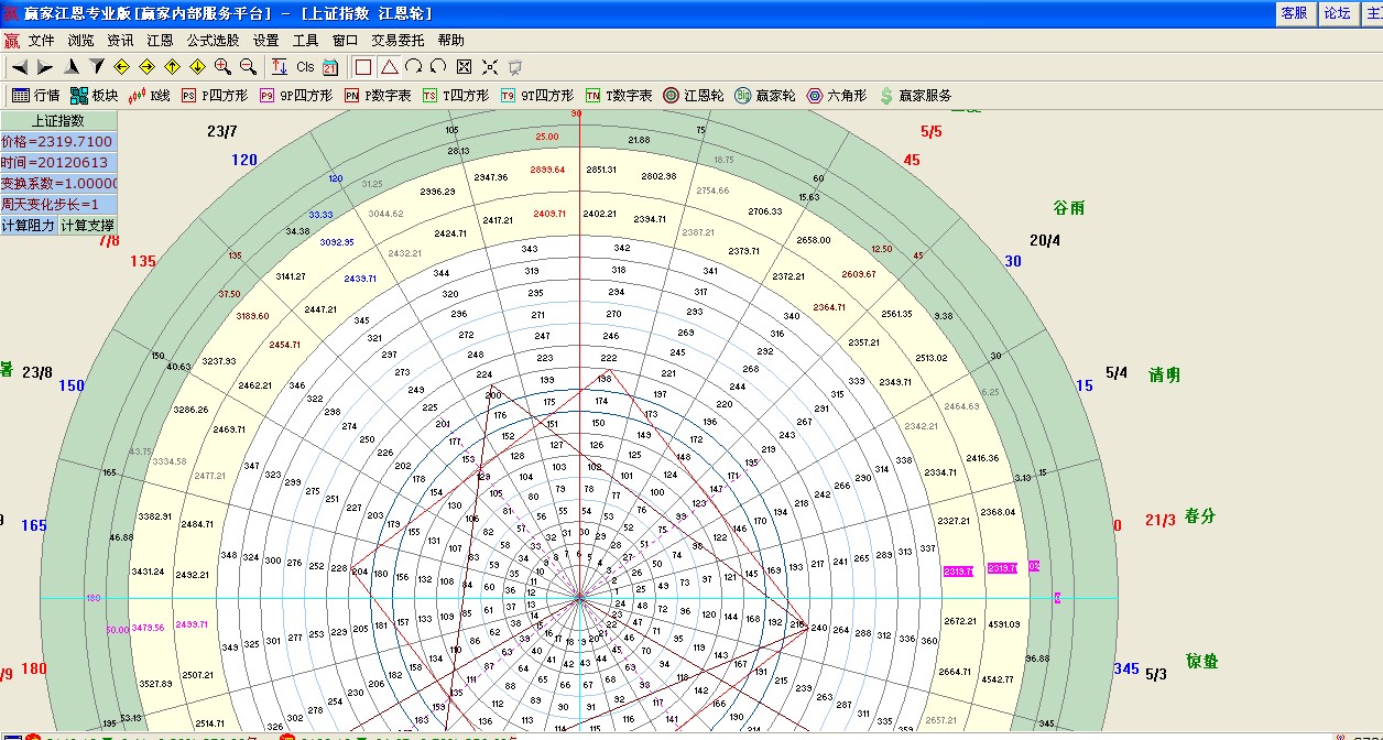 咨詢:13333833889贏家江恩輪中輪是依據(jù)江恩理論中關(guān)于時(shí)間周期循環(huán)理論、空間價(jià)格循環(huán)理論、疊加原理、同步原理、比例原理等講述為核心通過(guò)計(jì)算機(jī)語(yǔ)言編寫(xiě)而成,輪中輪是江恩經(jīng)典分析工具之一,其靈感來(lái)源宇宙時(shí)空關(guān)系,結(jié)合了歷法及日地運(yùn)行模式,地球自轉(zhuǎn)周期等時(shí)空關(guān)系,是江恩測(cè)市常用的工具,輪中輪中四方和三角的嵌套關(guān)系,從一個(gè)側(cè)面反應(yīng)出其循環(huán)的本源,是江恩預(yù)測(cè)理論的核心思路之一;