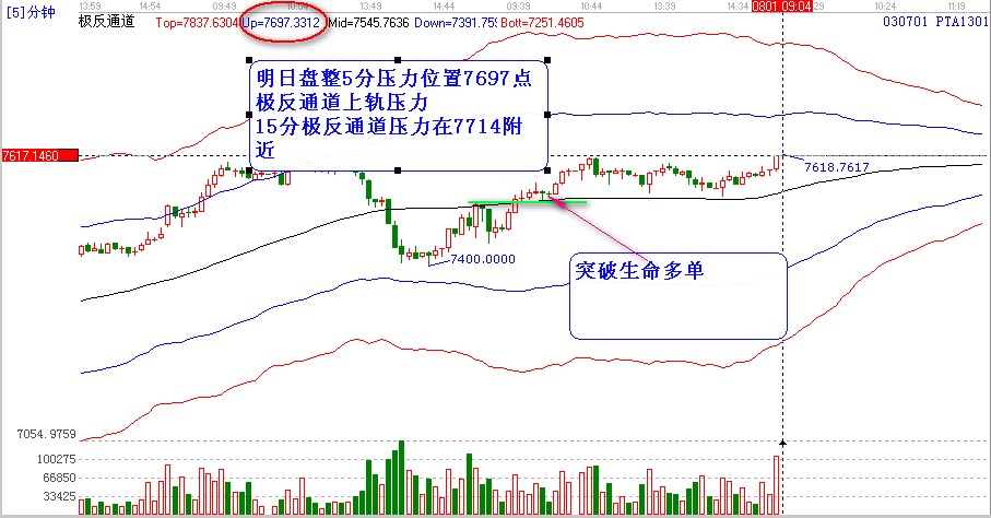 5 分鐘時間周期看pta:也是在突破極反通道生命線后的回踩然后開始的上攻,按照極反通道買賣規(guī)則,生命線不破看高一線,目標就是5分的極反通道上軌。
