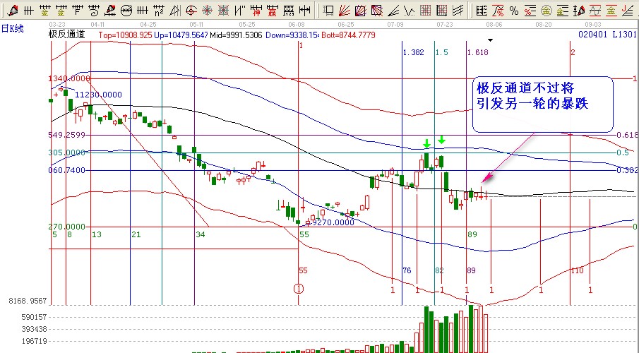 時(shí)間我們根據(jù)贏家的k線時(shí)間四方形點(diǎn)擊2012.6月8日的地點(diǎn),設(shè)置步長(zhǎng)為7對(duì)其展開的時(shí)間分割,可以看出在7.6日的一個(gè)短期下跌在7.13日的一個(gè)開始上攻,在7.20日的一個(gè)快速下跌,最近的7.27日大陽(yáng)后的盤整,都起到了一個(gè)重要的作用,明日8.3日也是這個(gè)時(shí)間窗口,如果不能突破極反通道生命線的位置【9740】點(diǎn)有可能結(jié)束盤整引發(fā)新一輪的下跌。