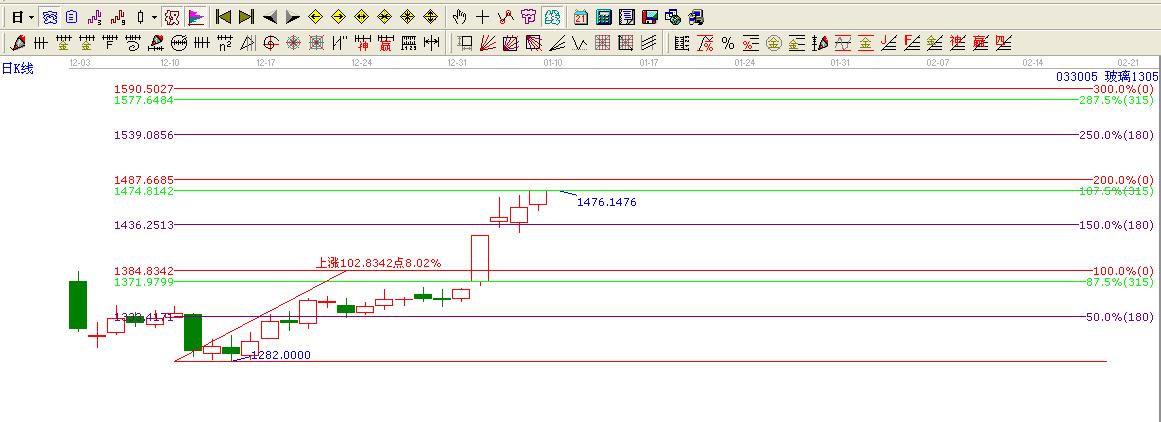那么我們反觀玻璃期貨,玻璃趨勢(shì)表現(xiàn)的如此之完美如果用心研究你會(huì)發(fā)現(xiàn),玻璃期貨上市第一天高點(diǎn)1385點(diǎn)跌至最低點(diǎn)位1282點(diǎn)跌了103點(diǎn),根據(jù)歷史我們可以得出結(jié)論以1282.00點(diǎn)為起點(diǎn)未來的壓力位置就是 1282.00+103.00=1385點(diǎn) 這里是其一倍的價(jià)格阻力位置,江恩最為重視的就是0.5的位置,那么同樣的在其1位置/1.5位置2位置2.5位置3位置3.5位置....這是一個(gè)價(jià)格的簡(jiǎn)單預(yù)測(cè)未來主要的位置,如果麻煩的話,那就用、用贏家的波段延伸完全可以完美的展現(xiàn)出來,我們只是需要在這些重要的位置注意下,是不是有見頂?shù)男盘?hào)就行了。如圖所示: