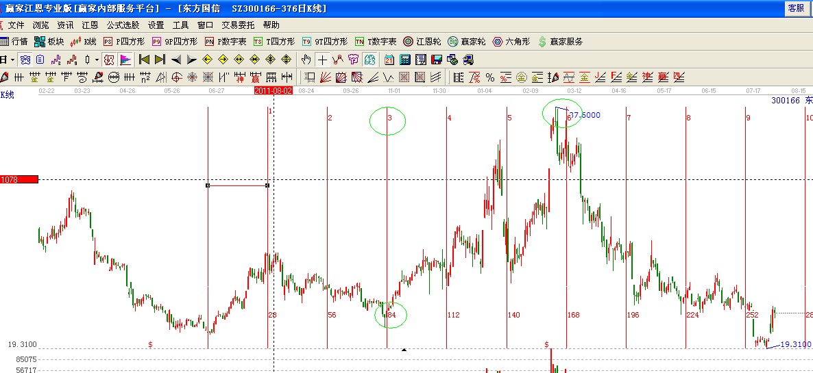 我們以創(chuàng)業(yè)板300166(東方國(guó)信)做分析,此股2011年6月20號(hào)創(chuàng)出階段性低點(diǎn)后展開60度左右的上攻,所用時(shí)間28天,漲幅31%,隨后轉(zhuǎn)為調(diào)整,然后整理的時(shí)間正好到84天,是原上漲周期的第3個(gè)循環(huán)的結(jié)束點(diǎn)上,然后股價(jià)再次上漲也正好用了三個(gè)循環(huán),這也整理時(shí)間的魅力;