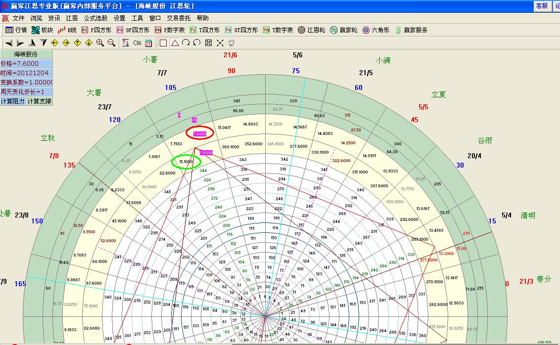 在看其江恩角度線最高點觸及了角度線2*3線位置, 次天再一次觸摸跌破也是最佳位置出局位置,這里也是其贏家江恩軟件工具極反通道紅色上軌強壓力位置的第2次觸摸,最為重要的是其江恩價格百分比0度位置是其15.20位置【次日盤中最高15.18】誤差了2分錢。種種提示都告訴你這里下跌不是偶然而是必然。